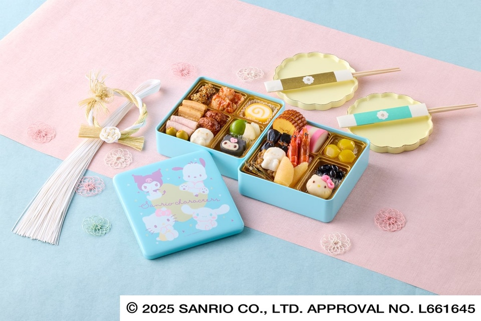 サンリオキャラクターが集まった和洋のおせち。かわいいお重は運動会やピクニックなどでも使える。