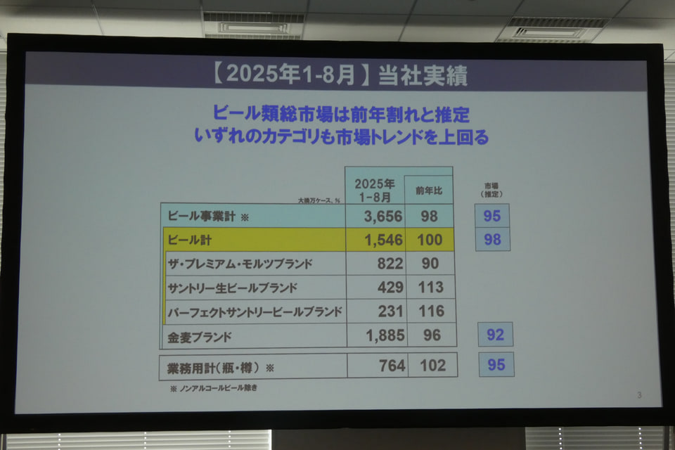 多田氏は、1月~8月の実績を振り返り、ビール類市場全体が前年比95%と推計されるなか、同社としては市場を3ポイント上回る98%となったことを紹介。ザ・プレミアム・モルツは前年比90%となったものの、サントリー生ビールが113%、パーフェクトサントリービールが116%と好調だったこともあり、狭義のビールでは100%となった。