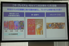 ザ・プレミアム・モルツについては、9月~12月にかけて4か月連続で限定品を発売することで接点の拡大を目指すとともに、ミシュランガイドと協力して品質訴求を行なっていく。
