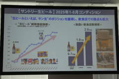 エコノミーカテゴリーに位置づけられる金麦ブランドは、市場全体が92%となるなか、96%と善戦。多田氏は「大健闘」と評価した。また、業務用については、市場全体が95%と減速したのに対し、同社は102%と市場を牽引。プレモルの接点を維持しつつサントリー生ビールの取扱店舗を増加させたことが好調につながった。