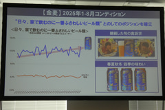 金麦が属するエコノミー市場は、1人あたりの購入量がビールより多く、安価な商品や価格に見合った価値を求めるニーズの高さを踏まえると、改めて活性化を図る必要があると指摘。「価格と価値のバランスが悪くなっており、価格以上に納得できる価値を出すこと、ビール化することで価値をつける」と、金麦のビール化の狙いを説明した。