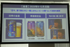 金麦については、“日々、家で飲むのに一番ふさわしいビール類”としてのポジションを確立できたとしつつ、四季にあわせて味わいを変化させる金麦らしく、冬の金麦を展開するほか、季節限定商品を投入。冬の定番メニューの鍋料理との相性のよさを訴求していく。