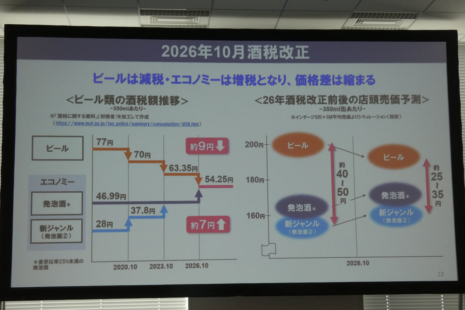 その後、多田氏は2026年10月の酒税改正の影響について、「ビールは減税、エコノミーは増税になり、350mlあたり54.25円に一本化される」が、価格差は縮小しながらも残るとの見方を示した。