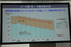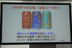 なお、多田氏は「プレミアム、スタンダード、エコノミー、健康系の4つのニーズが市場に残っていく」とし、ザ・プレミアム・モルツをプレミアム、サントリー生ビールをスタンダード、金麦をエコノミーに位置づけていると説明。金麦の販売価格については、「金麦の価格を上げるとエコノミーニーズに応えられない。増税程度の転嫁を検討しているところ」だとしている。
