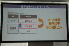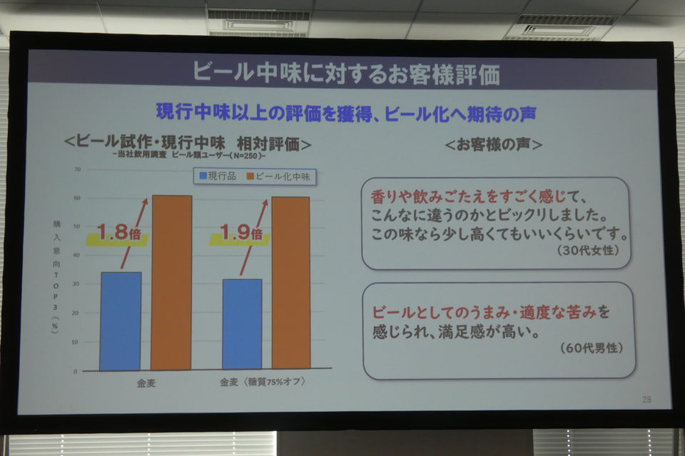 今回の発表会では、ビール化された両商品の試作品の試飲も行なわれたが、いずれも新ジャンルや発泡酒にはない、ビールらしい本格的な麦の風味や飲みごたえを感じることができた。