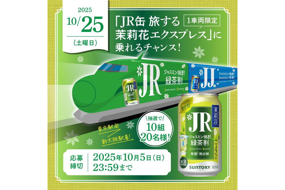 サントリーは、「茉莉花〈緑茶割・JR〉缶」の発売を記念し、JR東海とコラボした貸切新幹線「JR缶 旅する茉莉花エクスプレス」を10月25日に東京~新大阪間で1車両限定で運行する。