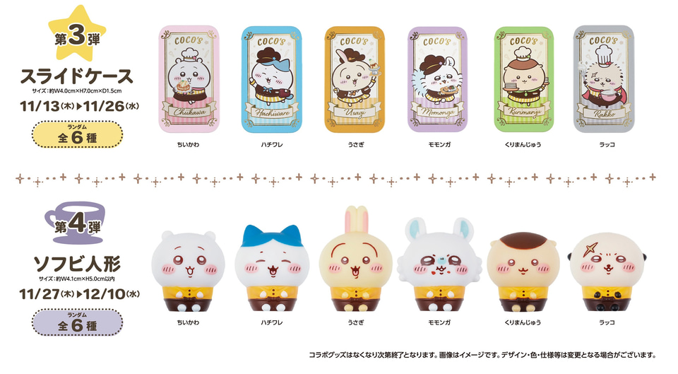 対象メニュー1品の注文につき、数量限定で「ちいかわ」のココス限定イラストを使用した「ココスオリジナルコラボグッズ」(ランダム・各弾6種)を1つプレゼントする。配布期間は4弾に分かれており、各弾でコラボグッズ・デザインが異なる。