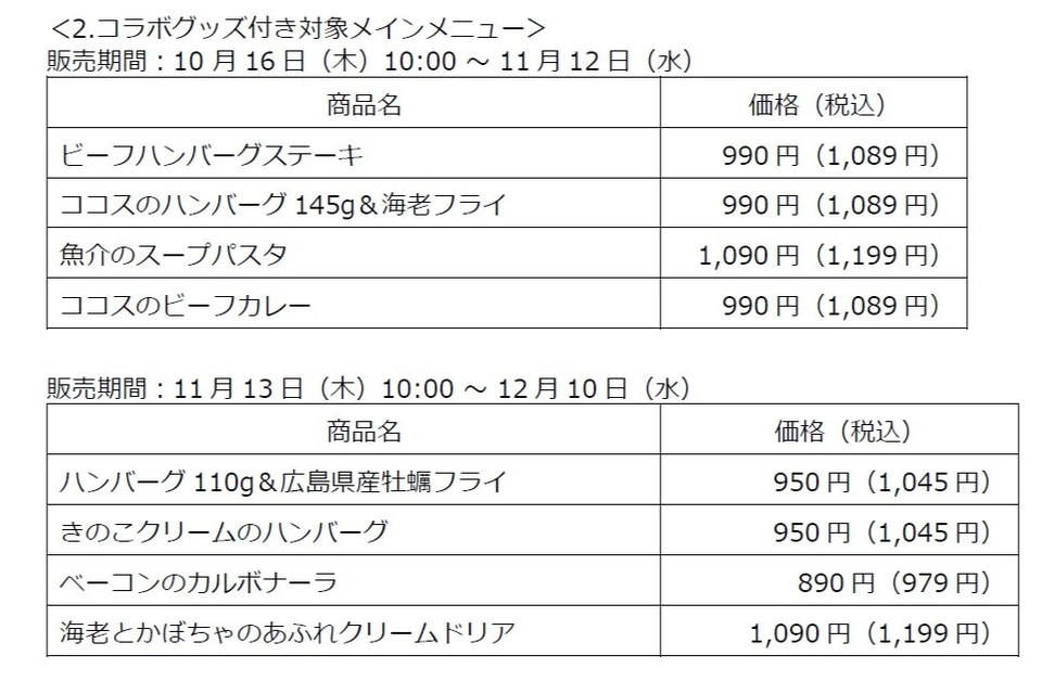 さらに、東京の平和台店では限定のラッピング装飾を行ない、4店舗限定で特別パネルやポスター・のぼりなどを設置、一部店舗では「ココス限定! オリジナルラバーキーホルダー」や「ココス限定! オリジナルキルティング風ポーチ」の販売、スタンディパネルも設置する。