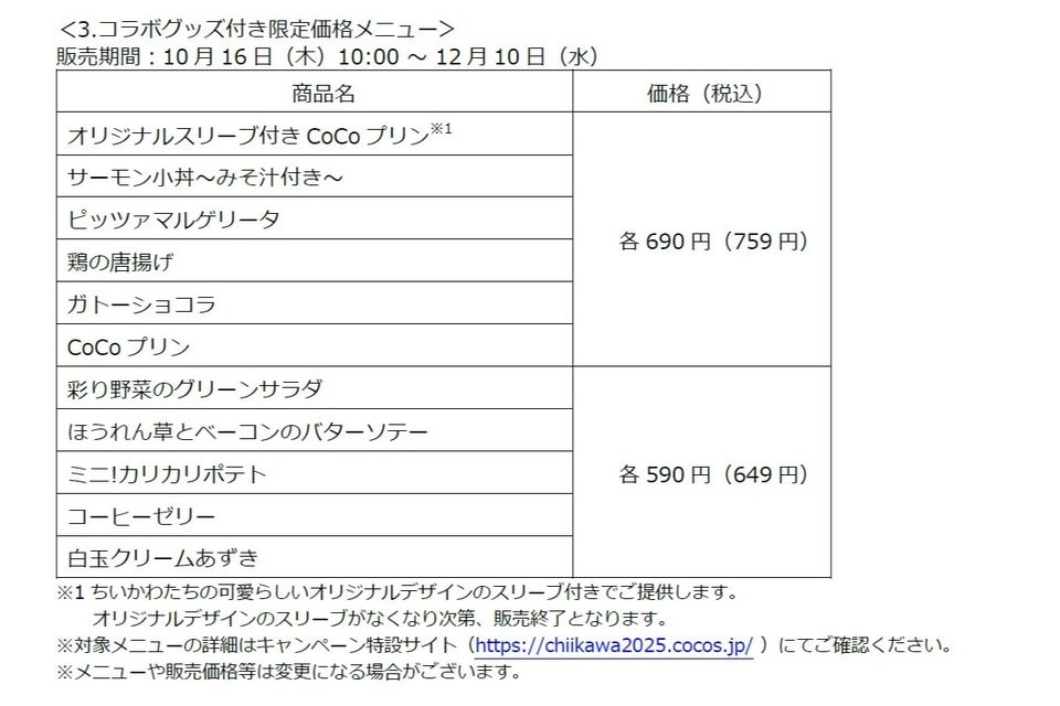 キャンペーン期間中、ちいかわたちや「ちいかわ」の世界観をイメージしたコラボメニューを計8品販売する。全メニューにイメージ元になっているキャラクターをデザインしたオリジナルピックが付く。