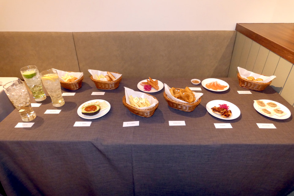 フードメニューは、ガーリックポテト、オニオンフライ、カリーブルスト、トマトサラダ、レバーペーストが390 FOOD、ガーリックシュリンプ&ポテト、スモークチーズフライ、フィッシュ&ポテト、アボカドサルサ、グリルチキンが490 FOODに設定されており、それぞれ単品でも390円、490円で提供される。