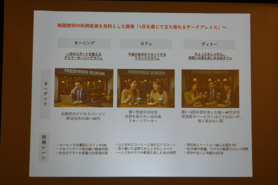 代表取締役社長の齋藤健太郎氏は、他のハンバーガーチェーンとは一線を画し、アルコールメニューを販売していることを自社の強みの一つだと語る。一方で、ランチの時間帯以外でいかに客席を埋めるかが課題になっており、モーニング、カフェ、ディナーの各時間帯で利用者のペルソナを設定し、“1日を通じて立ち寄れるサードプレイス”をコンセプトに、時間帯にあわせた商品設計を強化してきたとする。