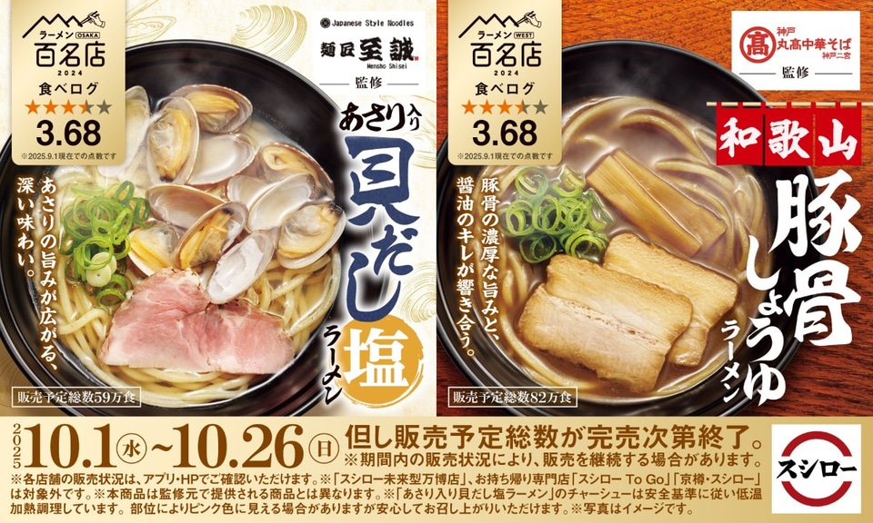 あきんどスシローは、「スシロー×食べログ」のコラボレーションの全国名店監修シリーズで、大阪の「麺匠至誠」監修の「あさり入り 貝だし塩ラーメン」と、和歌山ラーメンの名店「神戸・丸髙中華そば」監修の「和歌山 豚骨しょうゆ ラーメン」を発売する。