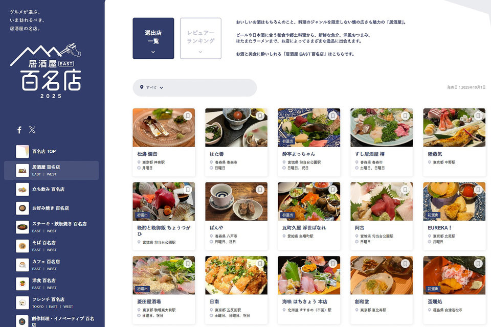 レストラン検索・予約サイト「食べログ」(カカクコム)は「食べログ 居酒屋 百名店 2025」EASTとWESTを発表した。