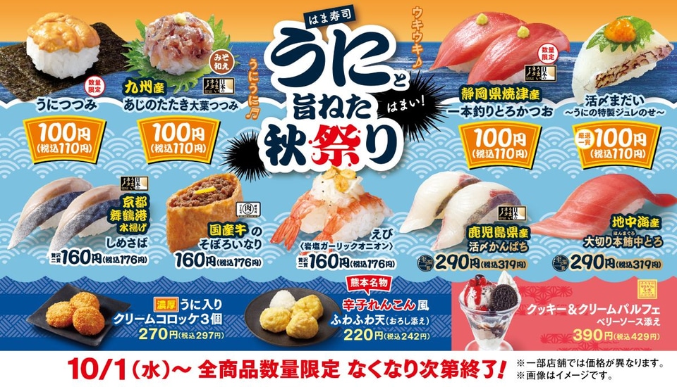 100円寿司チェーン「はま寿司」は「はま寿司 うにと旨ねた秋祭り」を開始した(なくなり次第終了)。