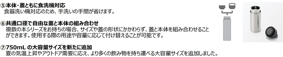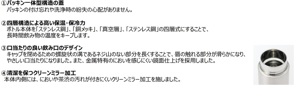 真空の二重構造で保温力を高め、フタはパッキン一体型でお手入れもしやすくなっている。内側は汚れが付きにくいクリーンミラー加工が施されている。