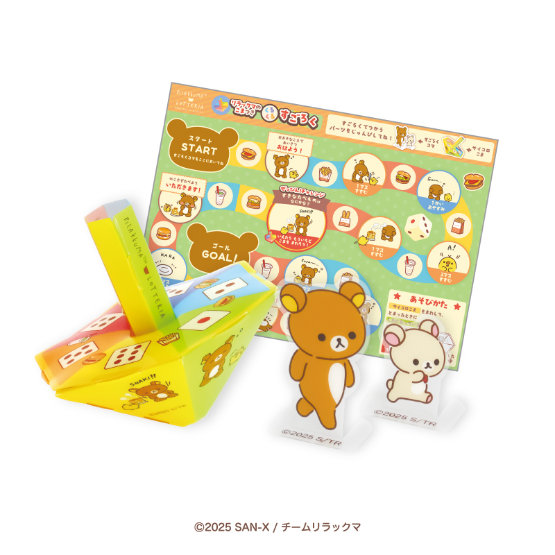 「リラックマおもちゃ」は、手紙を書いたり飾ったりできる「リラックマのテレビBOXつき おりがみレター」、シール遊びやだるま落としが楽しめる「リラックマのだいすきな ホットケーキだるま」、こまを回してすごろく遊びができる「リラックマのこまつき くるくるすごろく」となっている。