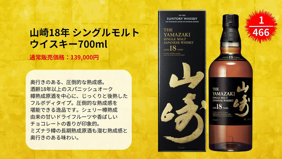 Webサイトで行なうウイスキーの抽選販売で、1口の価格は3980円。その場ですぐに結果が分かるのが特徴。1等のA賞はサントリーの「シングルモルトウイスキー山崎18年」(メーカー希望小売価格は5万5000円・税別)となっている。