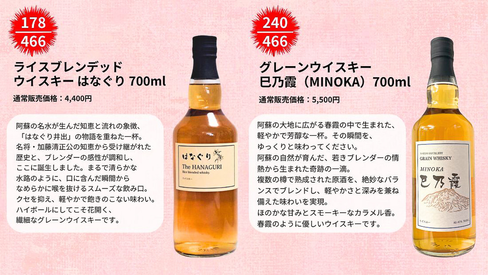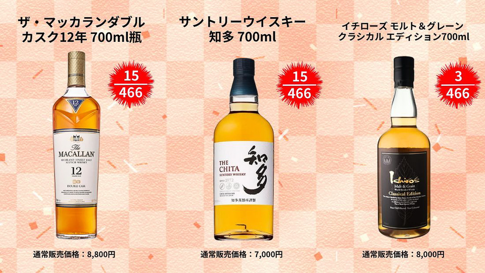 「オンラインくじ!」(アップライジング)は「第1弾 豪華ウイスキーみくじ(466口限定)」を実施している。