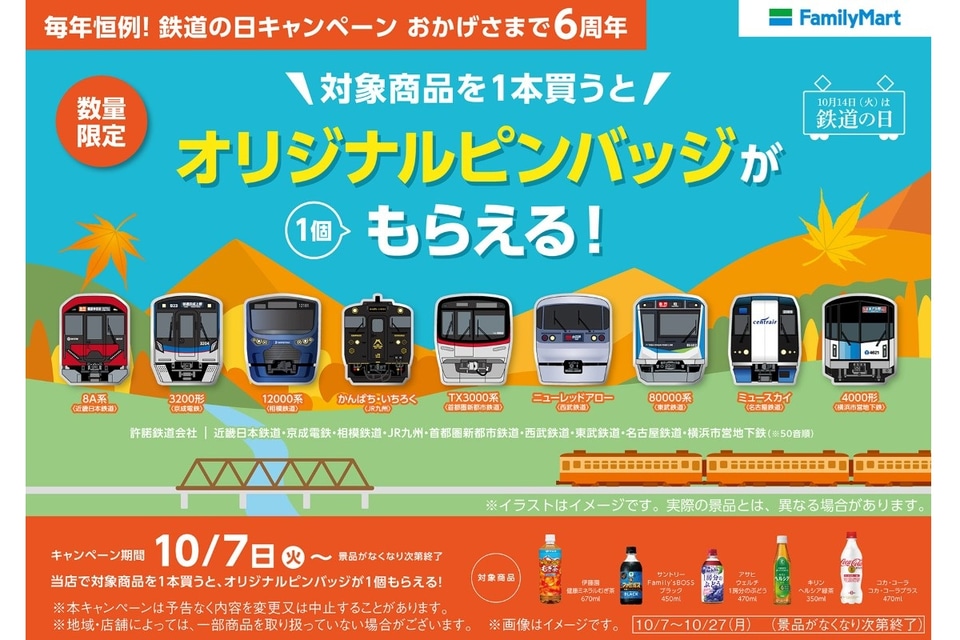 ファミリーマートは、提携する鉄道会社9社の店舗で対象のペットボトル飲料を購入すると、各鉄道の人気車両をデザインした「オリジナルピンバッジがもらえる!」キャンペーンを10月7日から実施する。