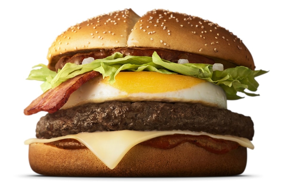 厚みのある100%ビーフと、たまごとシャキシャキのレタス、スモークベーコンとコクのあるホワイトチェダーチーズを加えたハンバーガー。炙り醤油風のソースがビーフとたまごを包み込む、バランスが絶妙でボリューミーに仕上がっている。