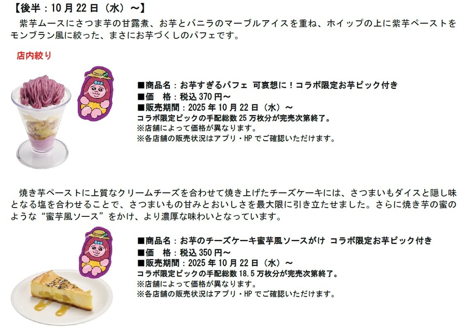 後半では、いかとえびのすしにチーズとバジルソースをトッピングして炙った「いかとえびのバジルチーズ炙り」にコラボ限定ピック(各全10種)を付けて提供し、「お芋すぎるパフェ」や「お芋のチーズケーキ蜜芋風ソースがけ」などのスイーツにコラボ限定お芋ピックが付くなど、オリジナルグッズと一緒に楽しめるメニューを揃えている。