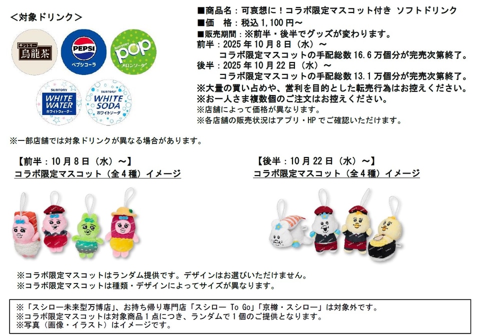 さらに前・後半で異なるコラボ限定マスコット(各全4種)付きのソフトドリンクが登場するほか、限定グッズやスシローで使用できる食事券が抽選で当たるSNSキャンペーンなども行なう。