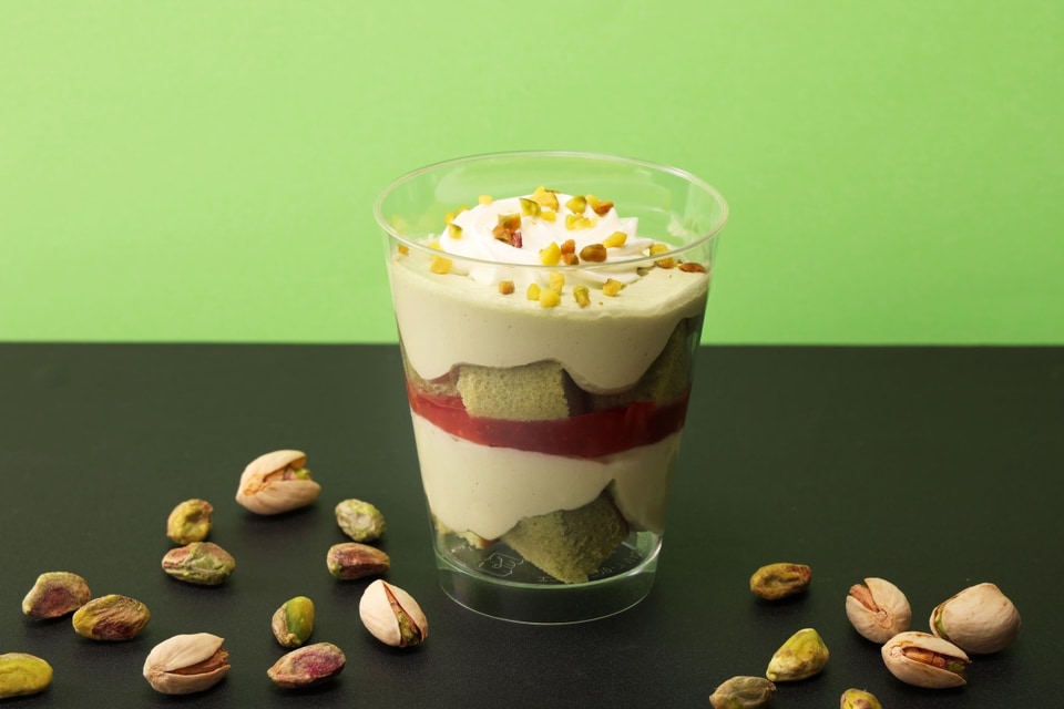 濃厚なピスタチオクリームを楽しめるパフェ。ピスタチオ風味のシフォンケーキ、ピスタチオクリーム、ベリーソースを重ね、その上にホイップクリームをのせ、食感のアクセントとして、砕いたピスタチオをトッピングしている。