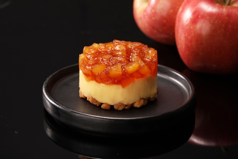ザクザク食感のクランブル生地の上に、甘さ控えめのカスタードをのせた。カスタードの上には、食べやすいサイズにカットしたりんごとカラメルソースをトッピングし、りんごの酸味と食感が楽しめるスイーツに仕上げた。