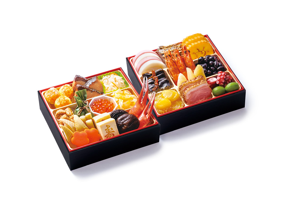 「彩り三段重」「彩り二段重」には、おせち定番の有頭海老や味付数の子、味付いくらなどが入り、人数や好みに合わせて選ぶことができる。また、「プレミアム三段重」「彩り三段重」には食事優待券が付く。