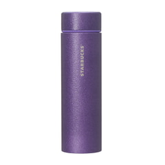 パープルのラメがキラキラと輝く真空二重構造ステンレスボトル。表にはスターバックスのワードロゴ、背面には猫の形をしたカスタマイズボックスをレーザー加工で表現した。フタを確実にしめることで漏れない構造を採用している。