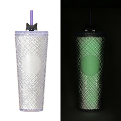 ストローに黒猫のアクセサリーが付いた冷たいドリンク専用のカップタンブラー。本体部分は暗闇で光る仕様で、色の変化も楽しめるようにした。