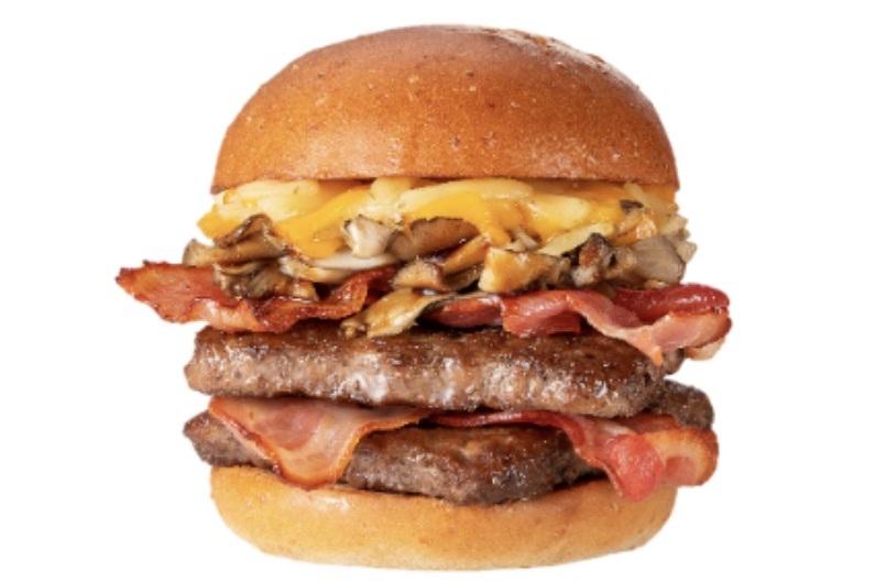 コラボバーガー「かけちゃったやつ」を、ダブルバージョンにアレンジした。ビーフパティの旨みと、アップルウッドで燻製されたカリカリなベーコンの味わいが存分に楽しめる。食べるたびに舞茸の食感や3種のチーズの味わいが楽しめ、最後までおいしく食べられる。