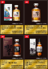 ウイスキー響の「 2025」「21年」、シングルモルトウイスキー山崎の「2025」「2024」「12年」「18年」、シングルモルトウイスキー白州の「2025」「2024」「12年」「18年」などが抽選で購入できるチャンスとなっている。