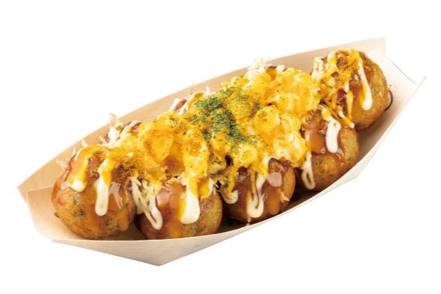 たこ焼に特製「てりやきソース」をかけ、パルメザンチーズとモッツァレラチーズの2種を合わせた「ミックスチーズ」、「たまごサラダ」をたっぷりトッピングし、濃厚な「卵黄ソース」をかけた。仕上げに約30種のスパイスをブレンドした「カレーパウダー」をふりかけることで、香り高くコク深い味わいに仕上げている。