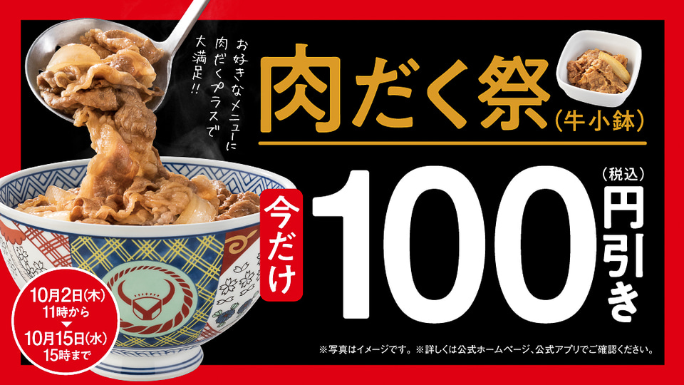 吉野家は「肉だく祭」を10月15日15時まで実施している。