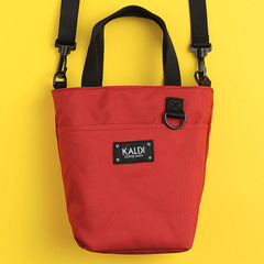 表裏合わせて全17種類のわんちゃんをデザインしたバッグはリバーシブル仕様。裏返すとKALDIのロゴが入ったシンプルバッグに。裏生地は撥水機能付きなので雨の日のおさんぽも安心。取り外しできるショルダーは、長さも調整できて、肩掛け斜めがけで使用できる。カラビナ付きのポーチは、消臭効果のあるエチケット袋が1ロール入っている。