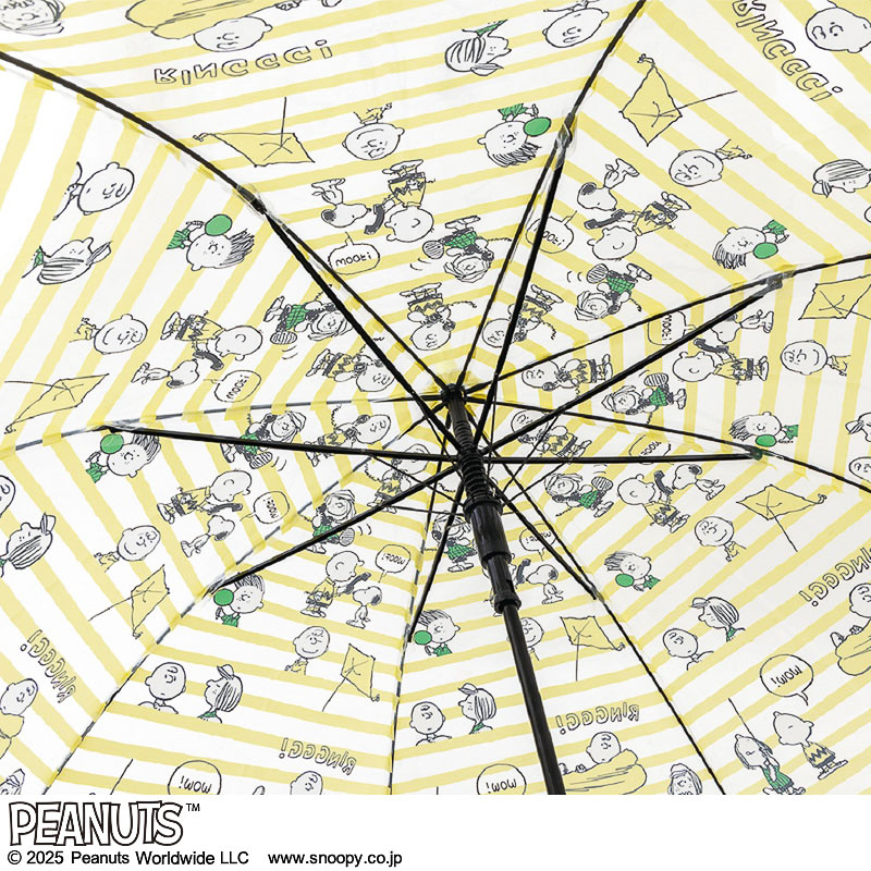 「NAVY」は濃い青で縁取りスヌーピーをワンポイントにあしらった落ち着いたデザイン、「YELLOW」はスヌーピー、チャーリー・ブラウン、ペパーミント パティたちを散りばめた楽しげなデザインになっている。傘の親骨の長さは約59cm。