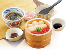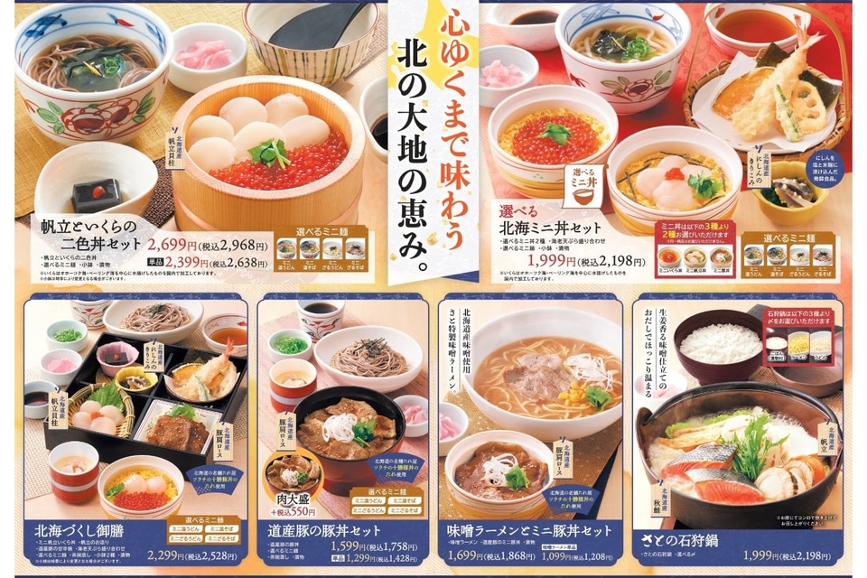 北海道産帆立貝柱や北海道の味覚を少しずつ楽しめる「北海づくし御膳」や、北海道産豚肩ロースをオーダーごとにていねいに焼き上げた「道産豚の豚丼」などのセットメニューをそろえている。また、北海道産の「帆立貝柱」を使用した「帆立のお造り」や「ミニ帆立丼」「ミニ豚丼」などをラインアップした「北海道食べ放題コース」も提供する。