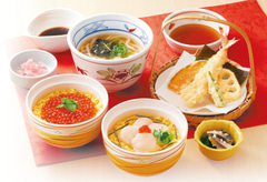 北海道産の食材使用のミニ帆立いくら丼、帆立のお造り、豚肩ロースを少しずつ贅沢に味わえる。