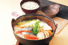 帆立・鮭・野菜を味噌ベースのだしで煮込んだ、北海道の郷土料理「石狩鍋」を再現した。