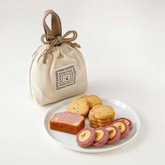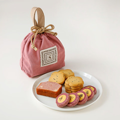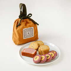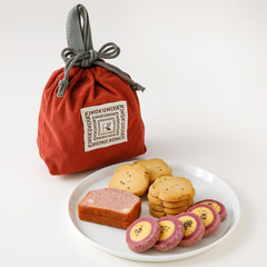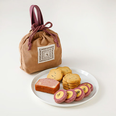 寒さを感じる季節に向けて、ふんわりとした優しい質感のコーデュロイ素材を使った巾着が登場。ころんとしたフォルムと手触りにほっこり。さつまいも風味の生地に香ばしいゴマを練り込んだサクサク食感の「プチフールクッキーさつまいも」、ほろっとした軽やかな食感の「さつまいもクッキー」、しっとり食感の「紫いもとホワイトチョコのパウンドケーキ」がセットになっている。