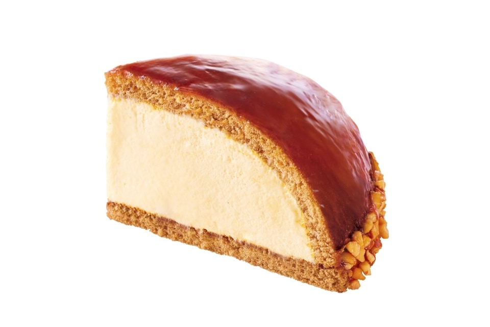 カラメルが染み込んだスポンジの上に、やさしい口どけのカスタードクリームをのせた。天面にも艶やかなカラメルをまとわせ、側面にはアーモンドをトッピング。香ばしさがしっかり感じられるように仕上げた。