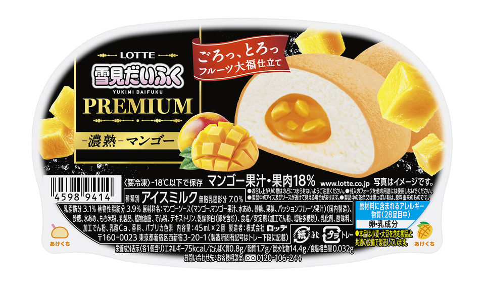ロッテ「雪見だいふくPREMIUM ‐濃熟‐マンゴー」 ロッテはプレミアムシリーズ「雪見だいふくPREMIUM ‐濃熟‐マンゴー」を11月10日に発売する。価格は248円前後。