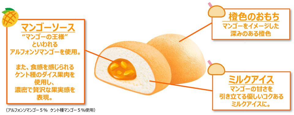 濃厚で熟したマンゴーの味わいを再現するために、ソース部には“マンゴーの王様”といわれるアルフォンソマンゴー果汁を使用。また、食感を感じられるケント種のダイス果肉を使用し、濃密で贅沢な果実感が味わえる。オンラインストアでは、業務用パッケージも販売する。