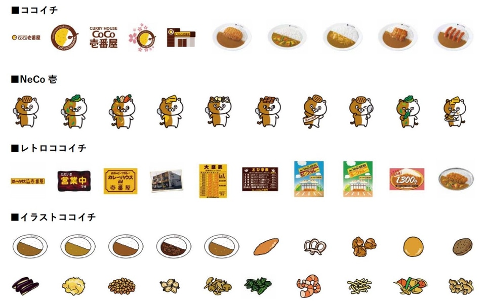 ロゴや人気カレーを集めた「ココイチ」、オリジナルキャラクター「NeCo壱」、昔懐かしい「レトロココイチ」、好きなトッピングのイラストを乗せて“推しカレー”を作れる「イラストココイチ」の4つのスタンプセットとなっている。