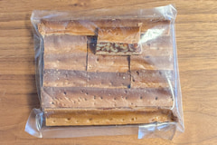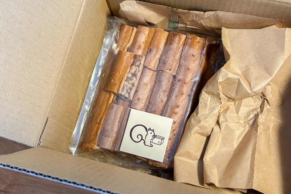 断面にはみっちりとクルミが入っているのが見えます。短い切り落としでも一口サイズというよりは少しボリューム感があり、長い切り落としは約16cmあって、1人で独占してモリモリ食べる醍醐味があります。食べてみるとやっぱり「クルミッ子」はおいしいな~としみじみ。端っこなのでしっとり感とサクッと感のバランスがこれはこれでとてもおいしく、毎回即完なのも納得です。前述のように準備さえしておけば購入は可能で、920円の送料はかかりますが1242円でクルミッ子をたっぷり楽しむことができるので、気になる方はぜひチャレンジしてみてください。