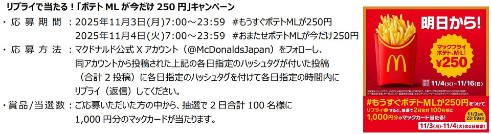日本マクドナルドは「トクニナルド」キャンペーンとして、「マックフライポテト」のMサイズとLサイズを250円で販売する。