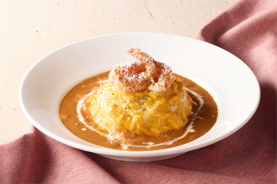 「今月のグルメ~11月~」では、海老の旨みが楽しめる2品が登場する。「炙り赤海老のふわとろオムライス~濃厚ビスクソース~」は、ブランド卵を使用したココスのふわとろオムライスに、海老やカニの旨みが詰まったビスクソース、店内で炙った赤海老3尾を合わせている。炙った赤海老の香ばしい風味と、ビスクソースの濃厚な味わいが食欲をかき立てる一皿。