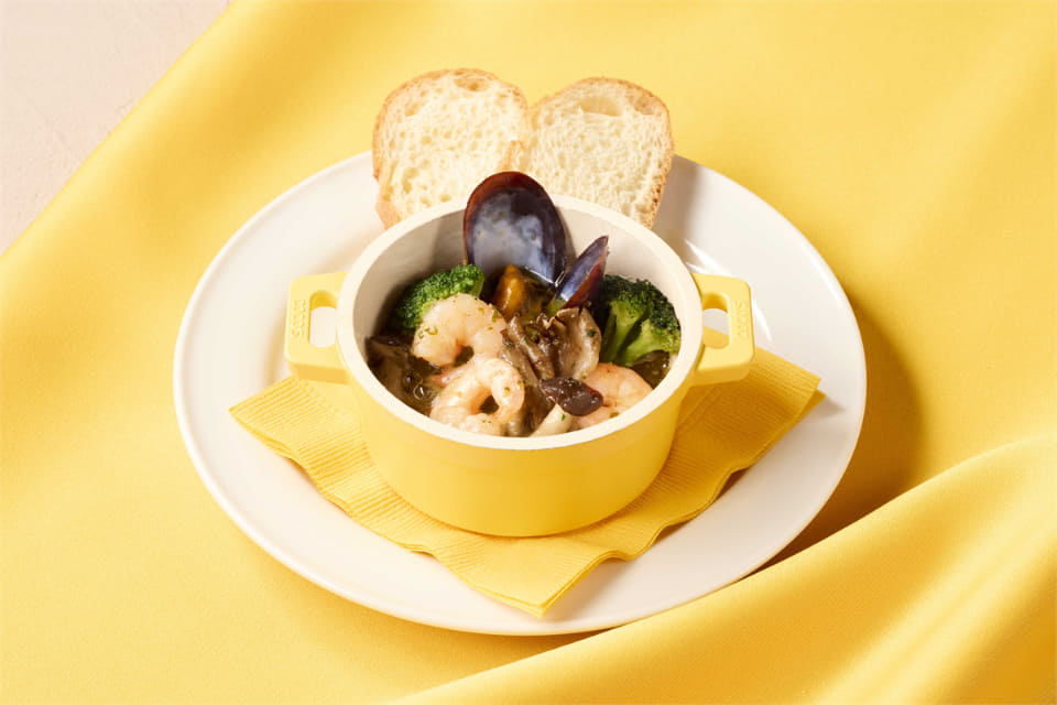 また、サイドメニューとして「海老とムール貝のアヒージョ」を用意する。海老やムール貝、しめじ、舞茸などの具材をアンチョビの旨みが溶け込んだオイルソースと合わせ、熱々に仕上げている。
