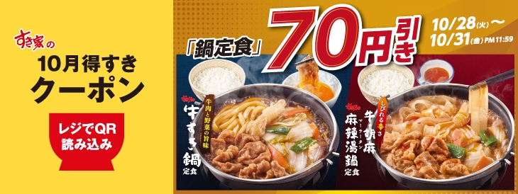 クーポンを利用すると期間限定の「牛すき鍋定食」「牛・胡麻麻辣湯鍋定食」が70円引きになるほか、「Sukiシェイク いちご」が30円引きとなる。期間中は何度でも利用できる。すき家公式アプリ上で対象商品を選択・決済するか、店頭会計時にすき家公式アプリからクーポンを提示すると適用される。
